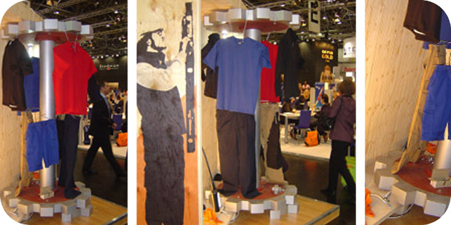 “We extended the working environment theme by building the display into a bespoke wooden crate fronting a scaffold structure, which formed the main workwear garment display, then added various electrical components as props extended the working environment theme. We even included a working hand control – as it comprised a remote power control unit the salesperson was able to stop the rotation once the preferred garment combinations were in alignment, and discuss the options with his customer.